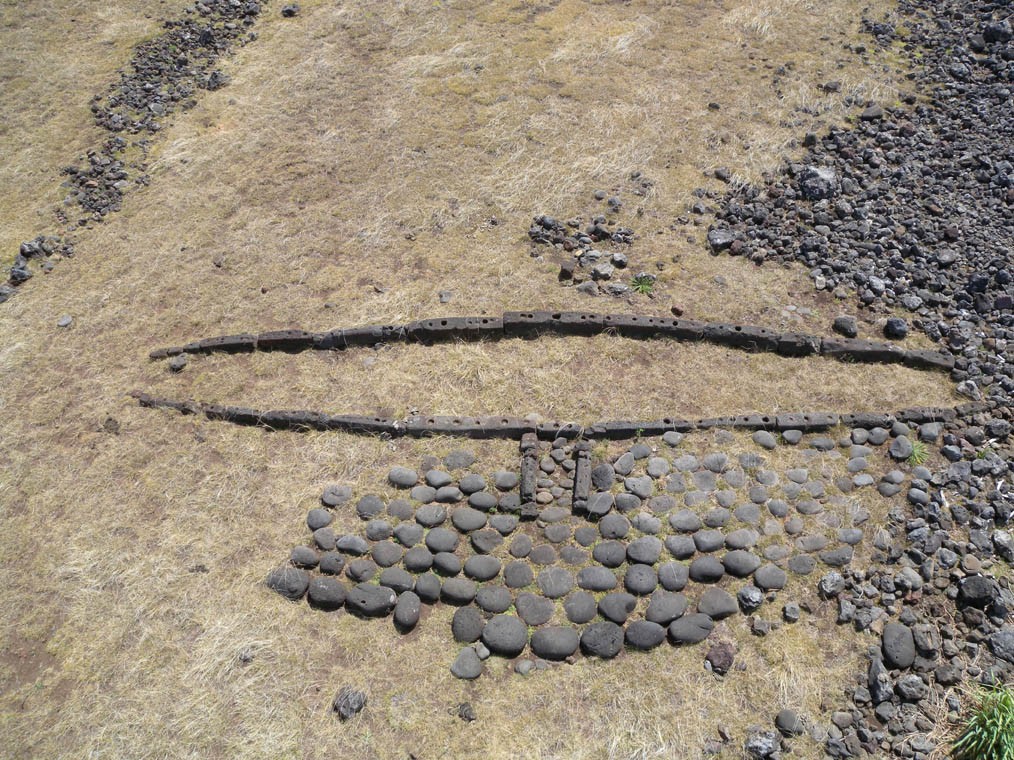 在海岸上有雕像标志,而处于陆海之界的Ahu,呈独木舟型,还有许多雕像置于其上,被认为是死后灵魂所在。在该地也发现了如房址、鸡舍、灶等遗迹,可见当时无木景观技术已十分精湛。岛上房屋呈独木舟形,多为多间房的套间。对当地水资源调查时也发现了大坝与排水坑,在全岛范围内也有收集雨水的石质容器。