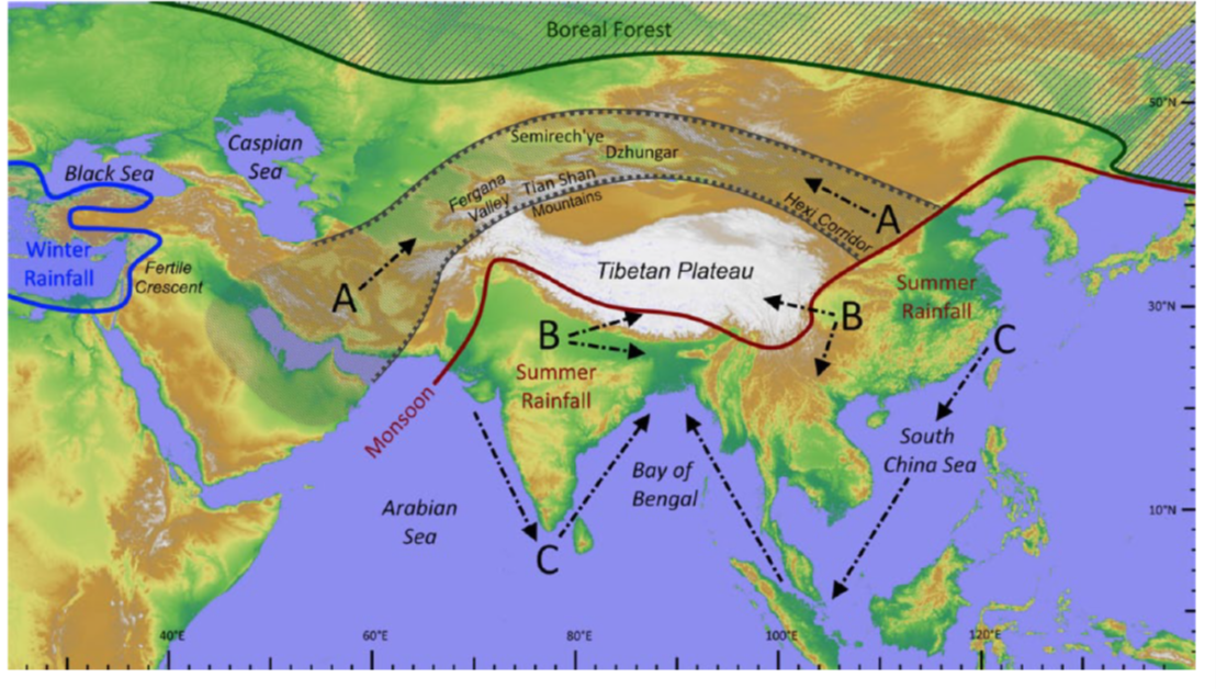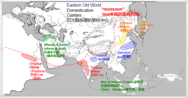 这些食物的传播横跨中国龙山时代晚期到青铜时代,印度河流域的后城邦时代以及印度哈拉帕文化晚期。那么,这是由外来移民带来的饮食文化?还是被接受并融入本地的饮食传统?这些我们都需要从各地农业的发展脉络来寻找线索。在旧大陆之上,东部季风区内中国南方最早利用了粳稻,印度是籼稻的起源地,而中国北方是粟、黍最早栽培利用之处。在西部中亚、西亚的非季风区,大麦和小麦以及绵羊和山羊最早驯化利用。现有的资料表明,由于地理环境和文化传统多样,西方的作物在新石器时代的印度得到了很好的接纳,本地的小米谷物也很好地发展。而西方麦类的传播却在中国有所延后,在龙山时代(2000 BC)以后才进入,而到青铜时代晚期才较普遍地出现在中原地区。这是与饮食烹饪传统的差异有关的。麦类的传播一直伴随着烤炉等遗迹的推广,而到了以蒸煮烹饪为传统的东亚地区,麦类需要融入这个体系之中,同时还要适应季风气候带来的环境改变。同样地,糯性谷物在此时也很难进入西部的印度和中亚地区。另外,从其他证据来看,公元前2000年是东西方作物、动物传播的关键时刻。这一时期,羊进入中国,使狩猎鹿类动物的比例下降。骆驼和马进入南亚和中国西部,促进了交通革命。驯化的粳稻与南亚未驯化的原始籼稻杂交促成了驯化籼稻的出现。公元前1900-1600年,中国原产的小米、稻米和桃等到达了印度西北部,而小米在公元前2300年左右到达了哈萨克斯坦地区。同时,在南亚还发现了许多中国风格的石刀等工具。这些证据表明,2000BC左右是文化碰撞和交流的重要时期。