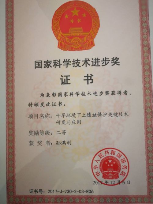 1月8日,“2017国家科学技术奖励大会”在人民大会堂胜利举行,党和国家领导人习近平、李克强、张高丽、王沪宁出席大会并为获奖代表颁奖。由敦煌研究院牵头,我校作为第三完成单位,我院孙满利教授作为完成人参与的“干旱环境下土遗址保护关键技术研发与应用”项目,获2017年度国家科技进步二等奖。